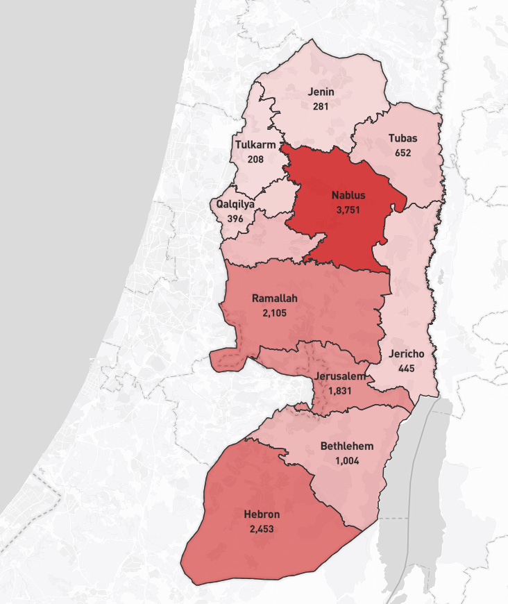 The geographic pattern reveals deliberate, persistent targeting. The Nablus governorate bears the heaviest burden, absorbing more than a quarter of all attacks over the past three years — 2,044 documented incidents. Hebron and Ramallah follow closely, each recording over 1,400 attacks during the same period. Together, these three governorates account for roughly two-thirds of all settler violence, corresponding to the concentration of settlement outposts and bypass roads fragmenting Palestinian communities in the northern West Bank.