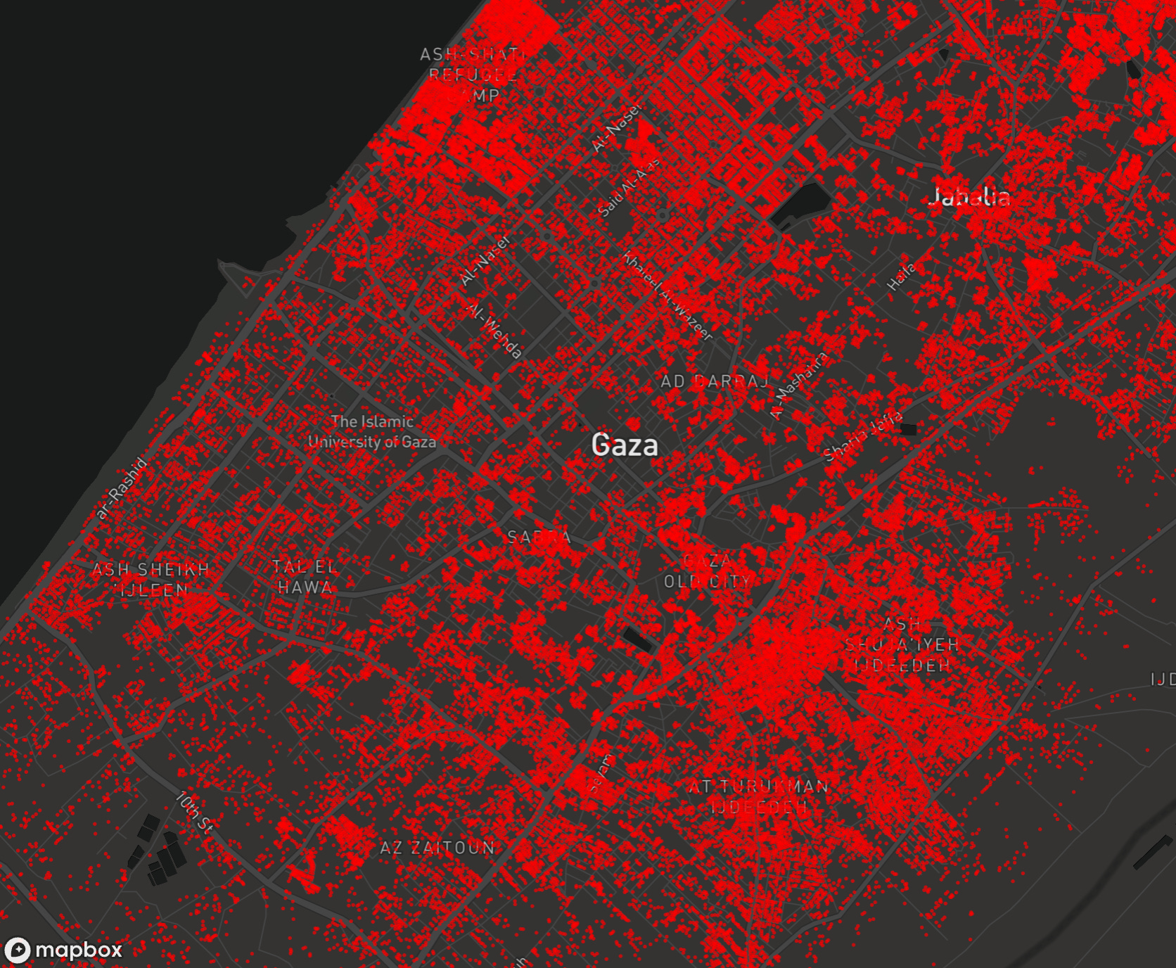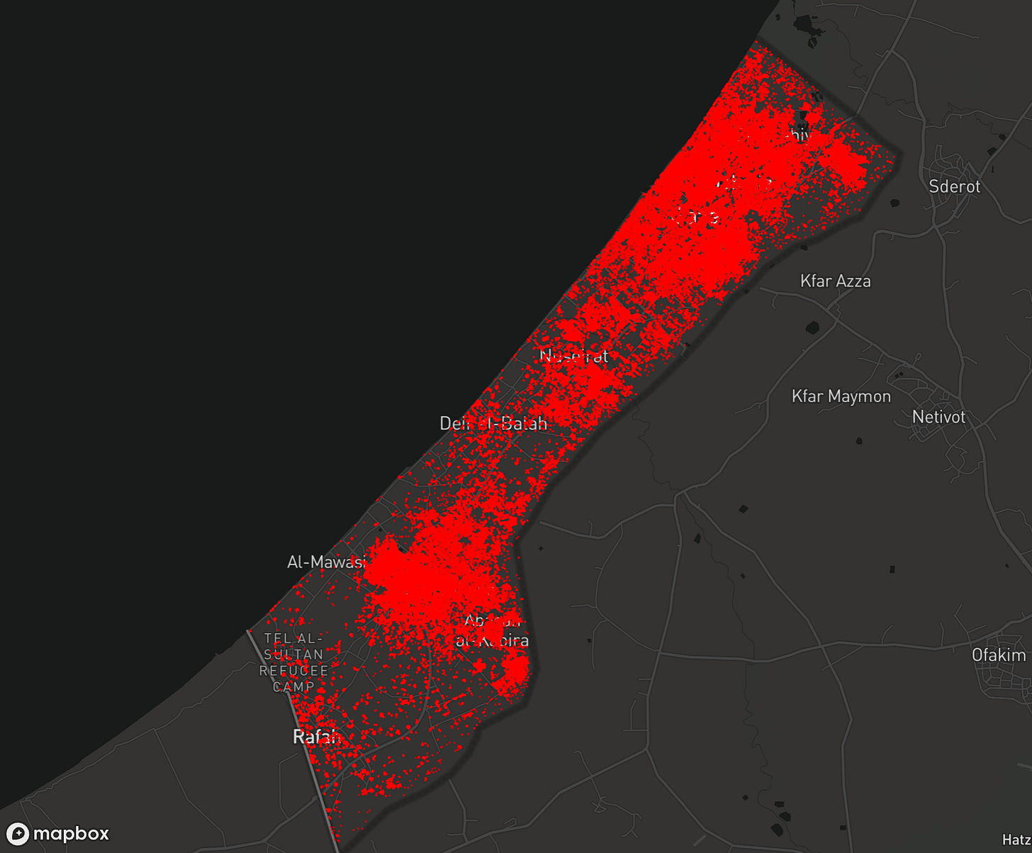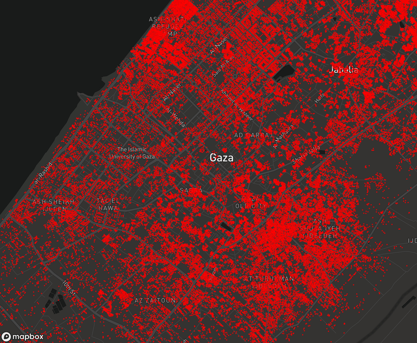 This systematic destruction of Gaza’s built environment, which has affected four out of every five structures across the entire Strip, represents the deliberate rendering of Palestinian territory uninhabitable, transforming an entire society’s homeland into an endless landscape of rubble while forcing survivors into perpetual internal exile. (For an up-close visualization, see the Good Shepherd Collective interactive map here.)