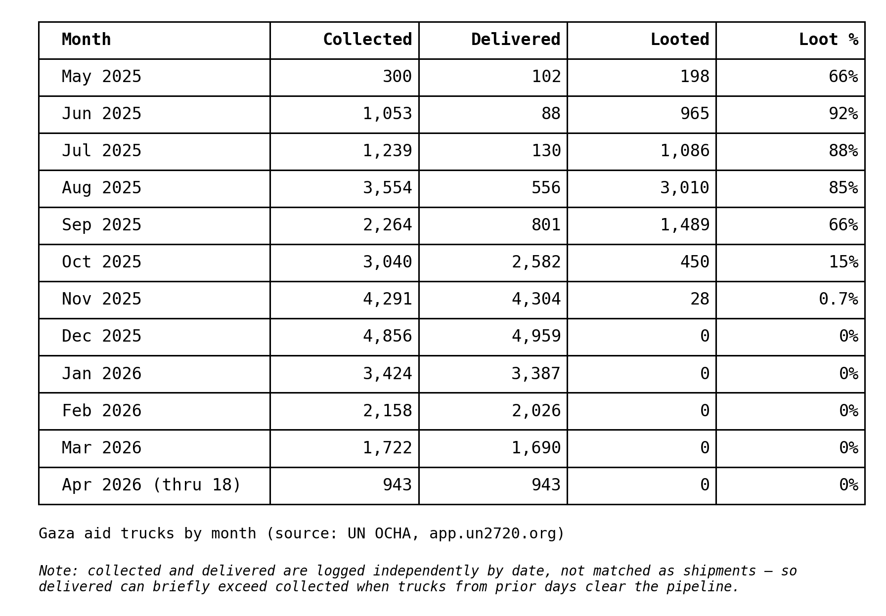 Then it stops. From October 2025, the loot rate falls to 15%, in November to 0.7%, and in December to zero. Year-to-date in 2026, of 8,247 trucks collected, 8,046 have been delivered — a 97.6% success rate, and zero logged as looted. The inflection is too sharp to be a coincidence: Palestinians and the collective government and resistant forces — including Hamas, of course — were able to bring a looting to an end.