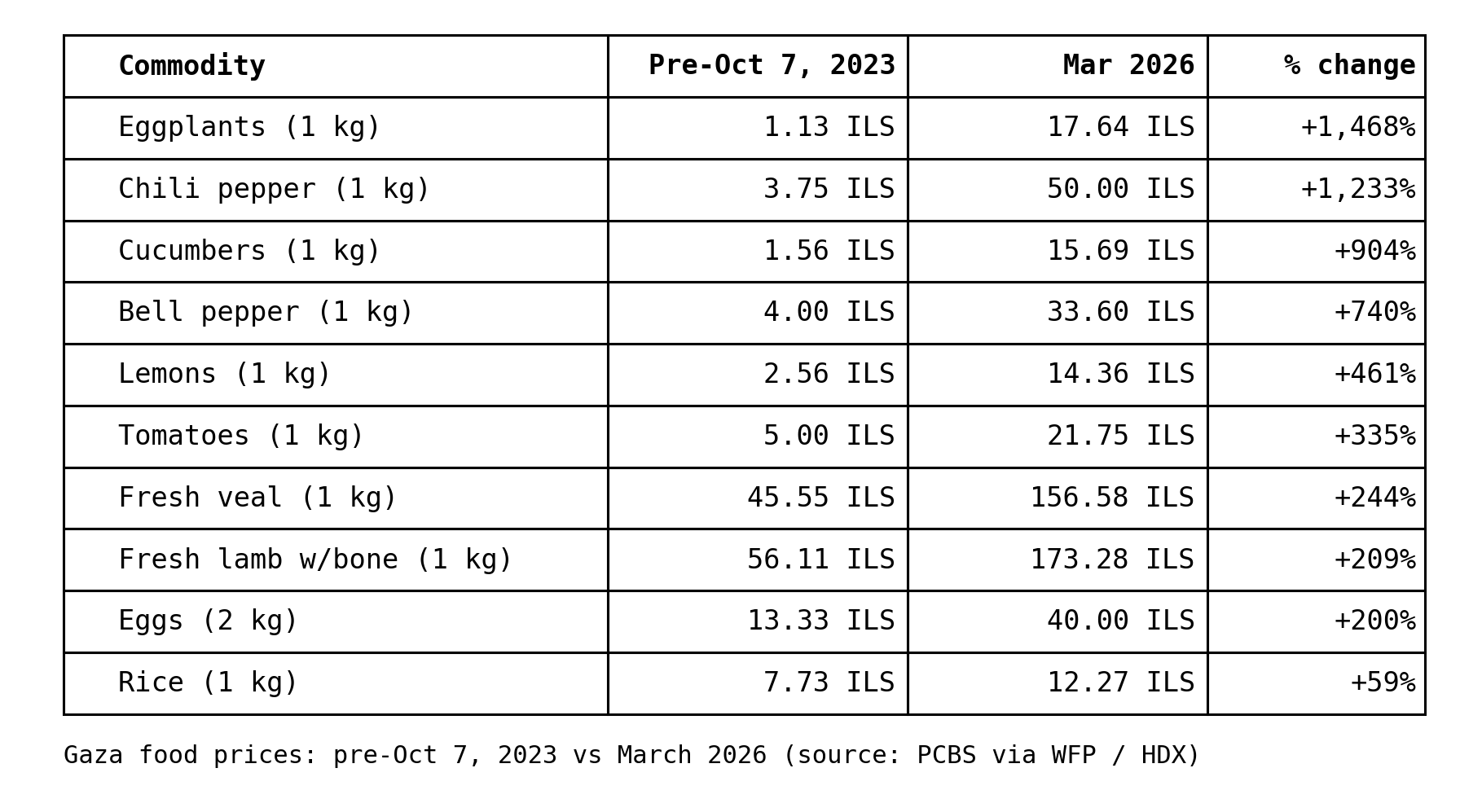 These armed proxies heavily manipulated market forces, which, of course, was by design. Against the pre-Oct 7, 2023 baseline prices, the five steepest price increases for basic food items in March 2026 were eggplants (+1,468%), chili pepper (+1,233%), gasoline (+1,093%), cucumbers (+904%), and the 12 kg cooking-gas cylinder (+853%). Fresh vegetables that used to be grown inside Gaza have risen between four and fifteen times: bell pepper +740%, lemons +461%, tomatoes +335%, potatoes +379%. Animal protein roughly tripled in price — veal +244%, lamb +209%, eggs +200%. The commodities that rose least are precisely the ones that dominate humanitarian aid baskets: rice +59%, bulgur +58%, sugar +40%. The split is really diagnostic. Goods that depended on Gaza’s own farms, fuel imports, and commercial supply chains — all of which Israel destroyed or blockaded with their own military, armed gangs, or the squatter gangs blocking the roads — ran away from baseline prices by factors of four, nine, and fifteen. Goods still arriving by aid truck have stabilized to pre-October 7, 2023, rates. Price, in other words, is tracking the siege itself: the steeper the climb, the more completely that commodity’s supply has been severed.