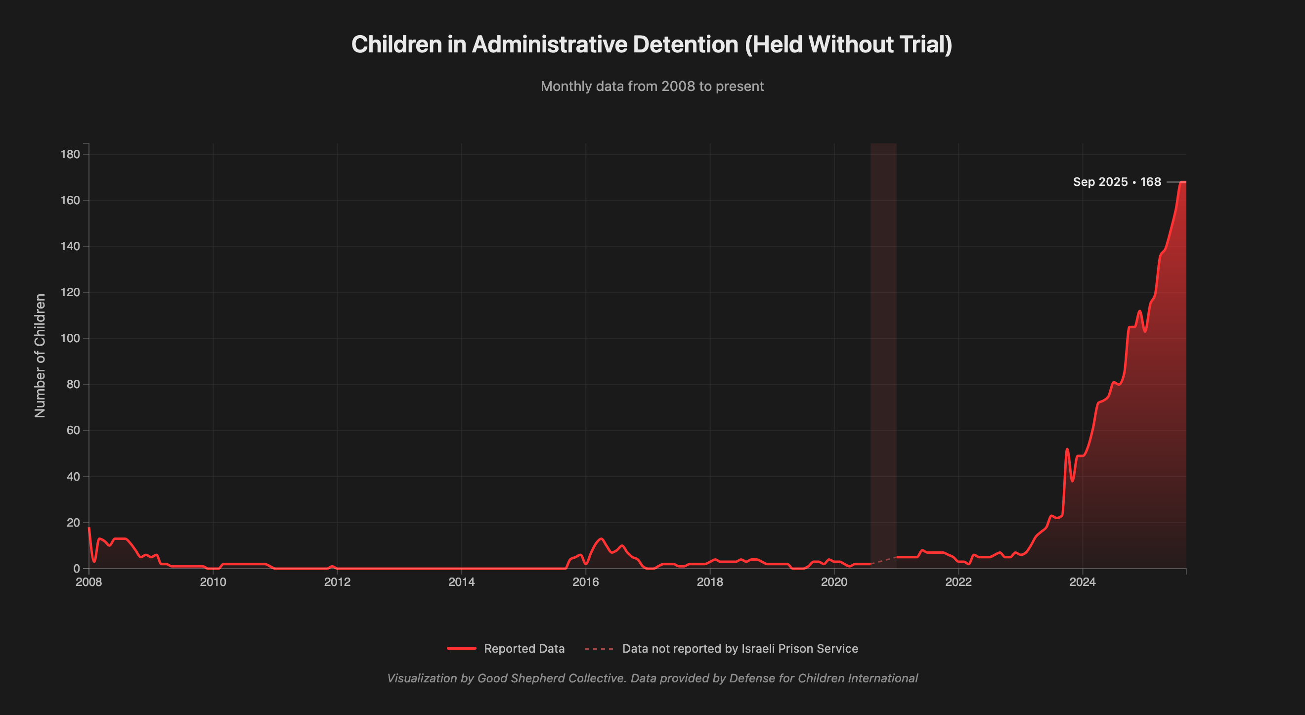 Following October 2023, detention numbers surged dramatically. From 204 children in October 2023, the figure climbed month after month: 287 by November 2024, 300 by December 2024, and continuing upward to 360 children by June 2025. The September 2025 figure of 350 detained children represents one of the highest totals in the dataset’s history. Equally concerning, data on children held under administrative detention (imprisonment without charge or trial) reached an all-time high of 112 children by December 2024, according to Defense for Children International-Palestine (DCIP).