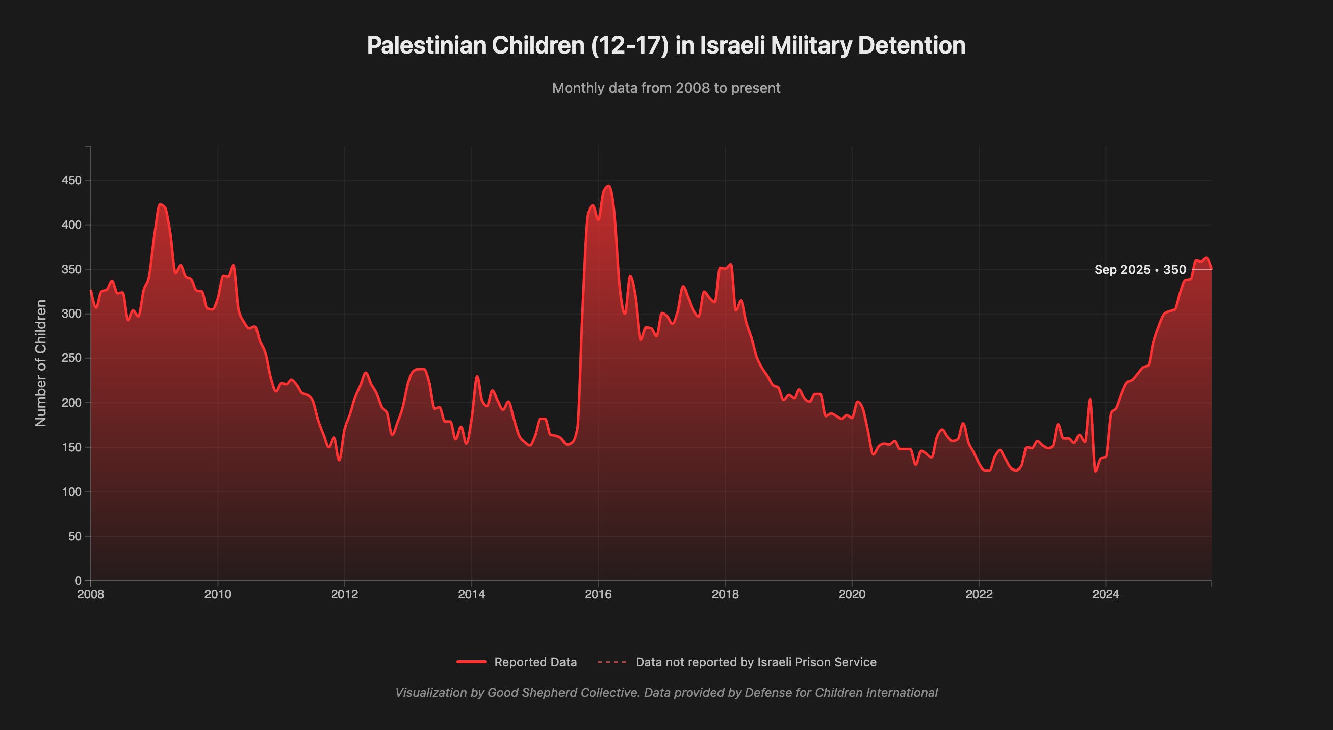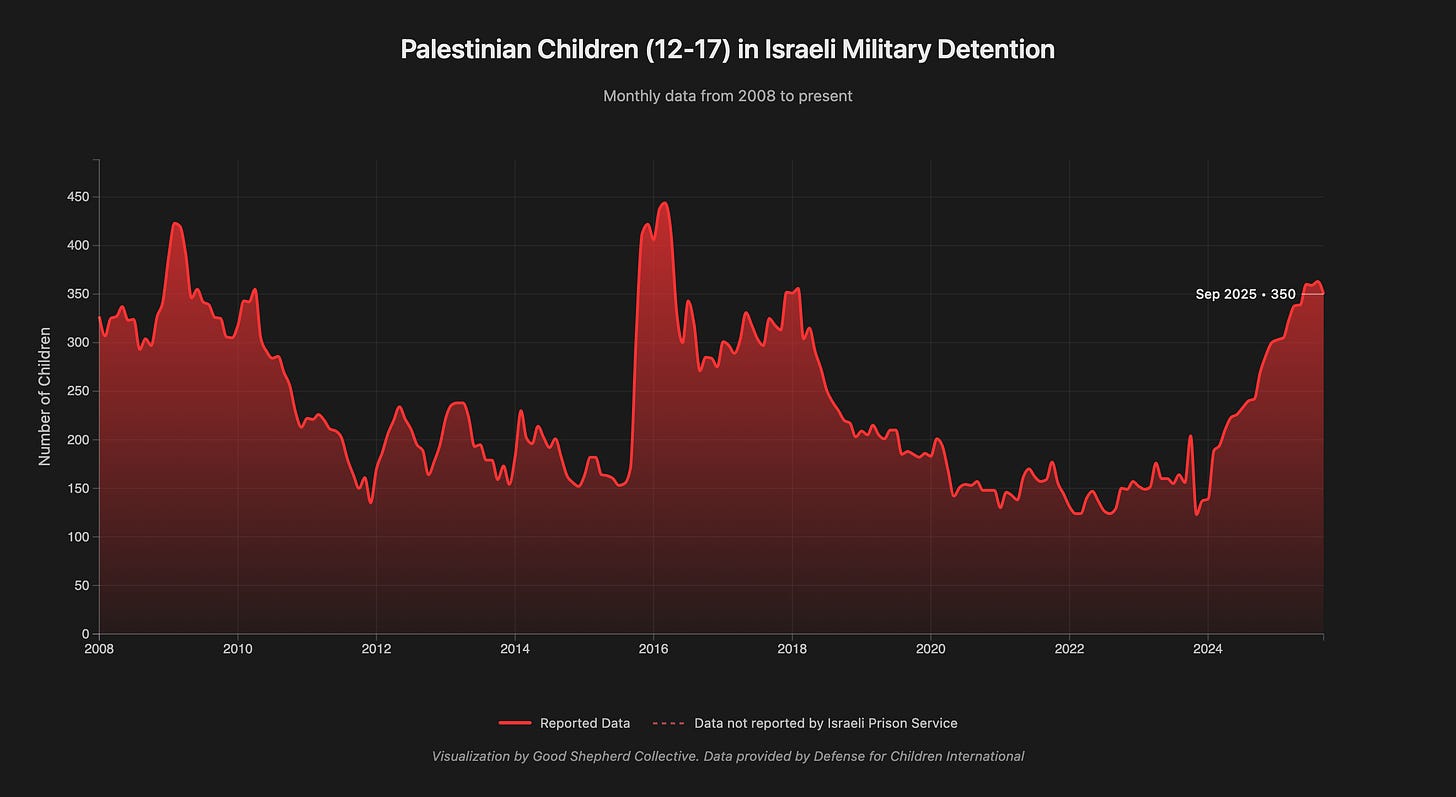 The broader zionist movement has maintained a continuous practice of detaining Palestinian children from the West Bank, Gaza, and East Jerusalem. Monthly data compiled from the Israel Prison Service reveals a troubling pattern: at no point in the past seventeen years has the number of detained Palestinian minors dropped to zero. The data tells a story of systematic incarceration that has now reached historic highs, with 350 children held in Israeli military detention as of September 2025.